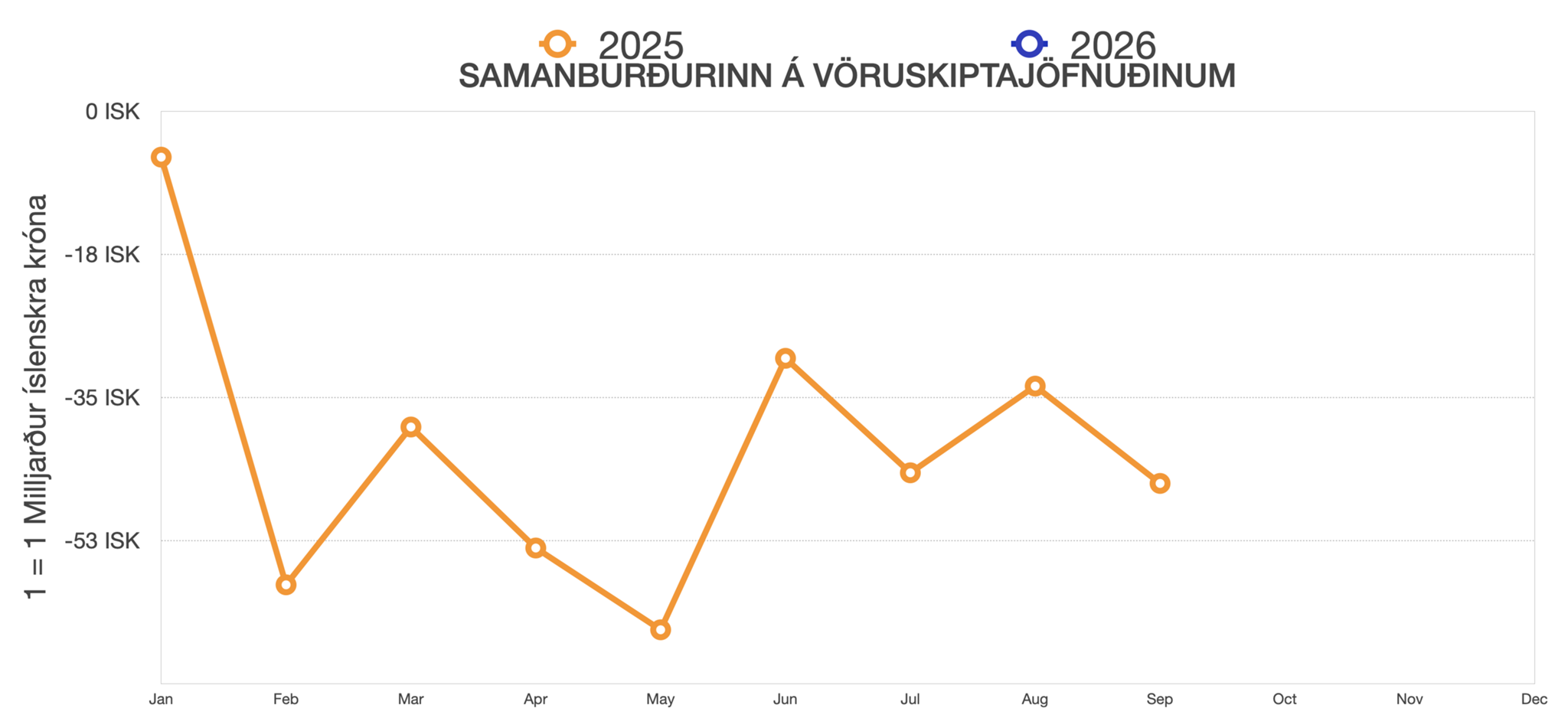 VÖRUSKIPTAJÖFNUÐURINN var 45,5 MILLJARÐAR í mínus í SEPTEMBER 2025 samkvæmt BRÁÐABIRGÐA-TÖLUM: